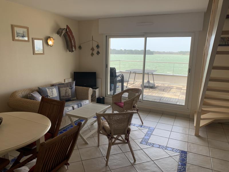 Nice duplex apartment at the first floor of the little "résidence de la Plage" bordering the river, enjoying a wonderful view on the sea and the sunset (facing west). Swimming possible in front of the residence. Ile Tudy