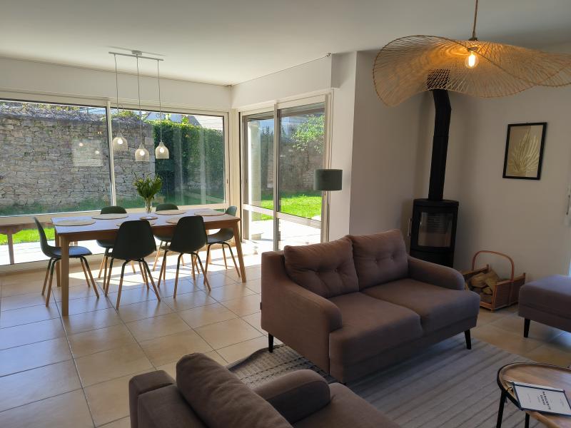 Großes L-förmiges Wohnzimmer mit voll ausgestatteter Küche, Essbereich, der auf die südlich gelegene Terrasse führt, und einem Wohnzimmerbereich mit Kaminofen.