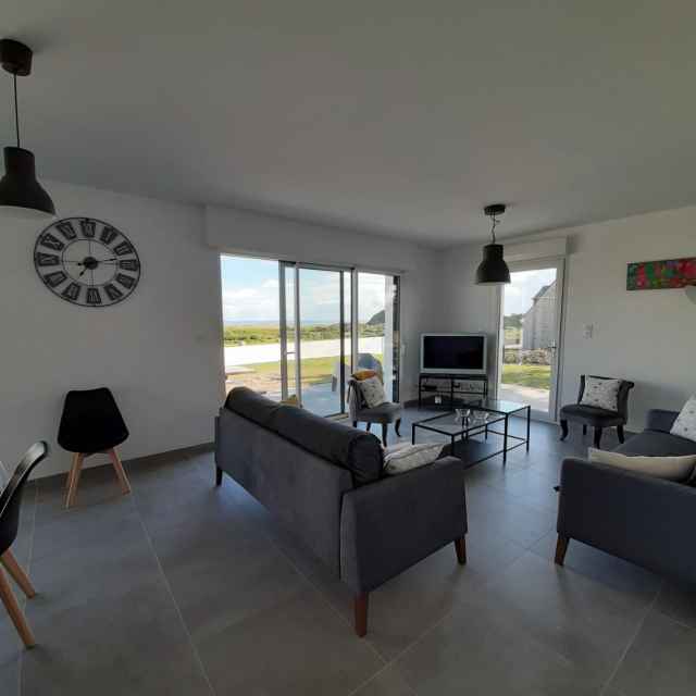 – Großes Wohnzimmer mit integrierter Küche, die auf die Südt Terrasse öffnet: schöner Meerblick am Horizont